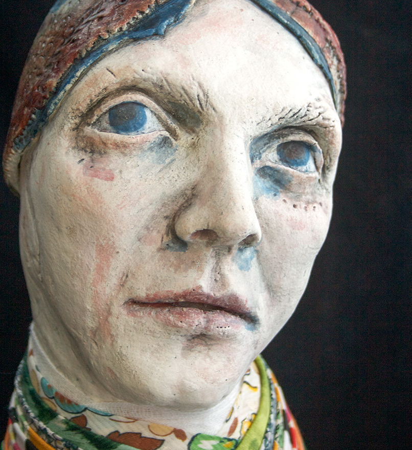 hand built ceramic sculpture, engobe, underglaze, japanese tissue stencils, vintage apron and kimono silks, embridery, decaying canvas 50 x 30 x 20 cm