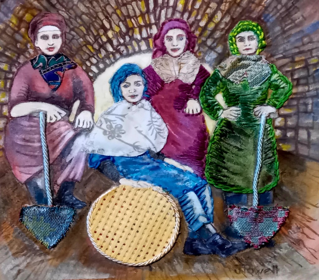 i have entered the above mixed media piece called screen lasses.. in the 1900’s women in the welsh valleys worked as screen lasses at the top of the mines sifting the coal for impurities. above is a mixed media piece showing them with their tools